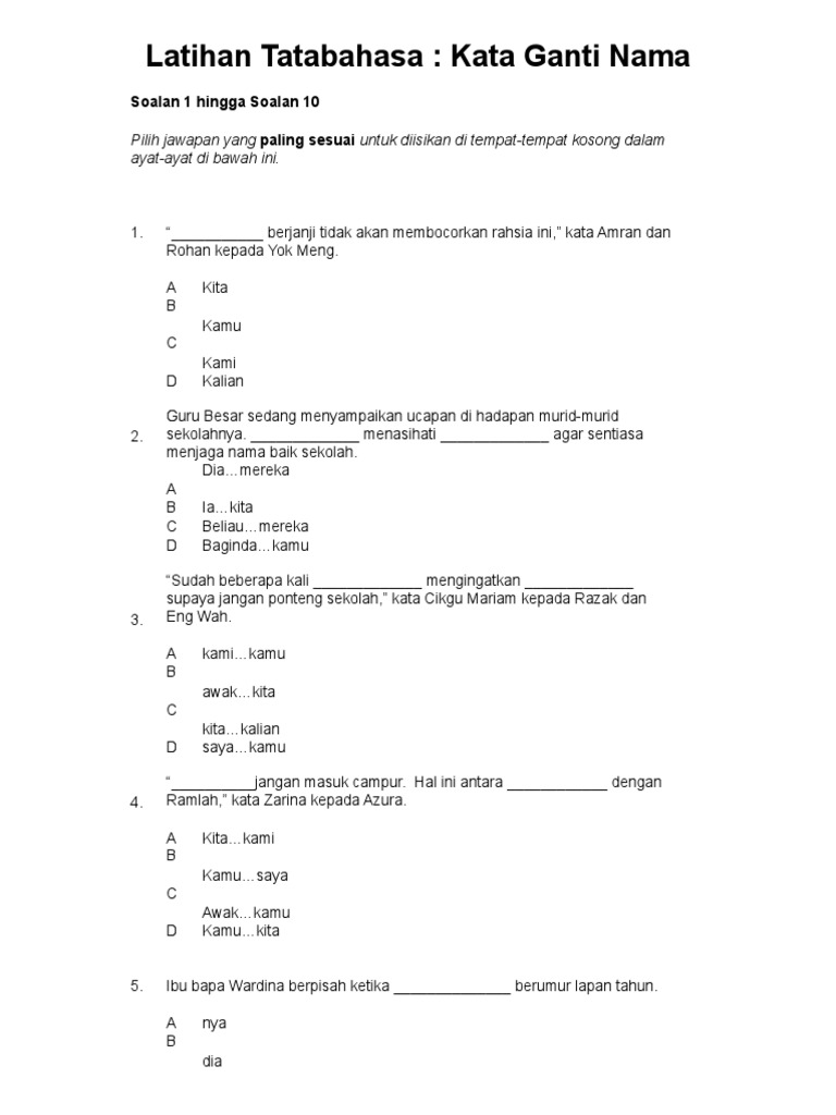 Tatabahasa latihan kata ganti nama diri tahun 1. 20 lah ucapan daripada guru besar kata juruacara majlis. Kata ganti nama diri terbahagi kepada 3 jenis iaitu kata ganti nama diri pertama penutur kata ganti nama diri kedua pendengar dan kata ganti nama diri ketiga pihak. A ini b begini c begitu d demikian 21 ibu duit adik farah hilang semasa bermain seorang diri di taman permainan kata umi kepada ibunya. Kata ganti nama diri singkat 1.