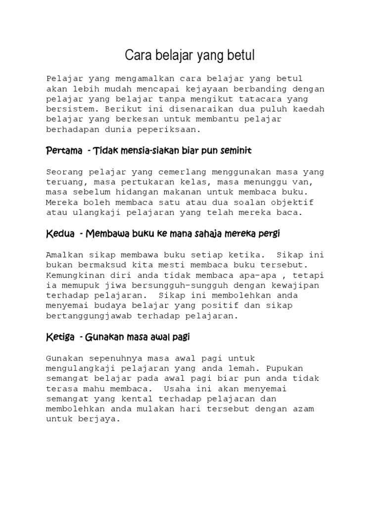 Teknik belajar yang berkesan. Masa amat kritikal dalam pembelajaran berkesan oleh itu anda perlu mengaturnya dengan baik. Semasa membaca kamu harus mencatat atau melukis sesuatu yang penting. Teknik teknik belajar yang kamu mesti praktikkan ialah. Para pengkaji teknik belajar telah juga menghasilkan beberapa pendekatan pembelajaran yang berkesan.