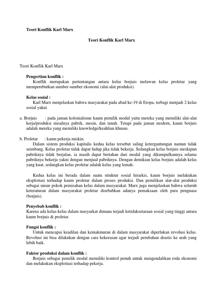 Teori konflik karl marx. Rg squad kamu pernah dengar nama karl marx. Inti teori konflik karl marx menurut karl marx teori konflik adalah salah satu perspektif di dalam sosiologi yang memandang masyarakat sebagai satu sistem sosial yang terdiri dari bagian bagian dan komponen komponen yang mempunyai kepantingan yang berbeda beda dimana komponen yang satu berusaha untuk menaklukan komponen yang lain guna memenuhi kepentingannya masing masing. Dasar teori konflik yang diprakarsai oleh marx berkembang seiring waktu. Antonio gramsci melihat terjadinya hegemoni kultural yang dilakukan oleh minoritas berkuasa.