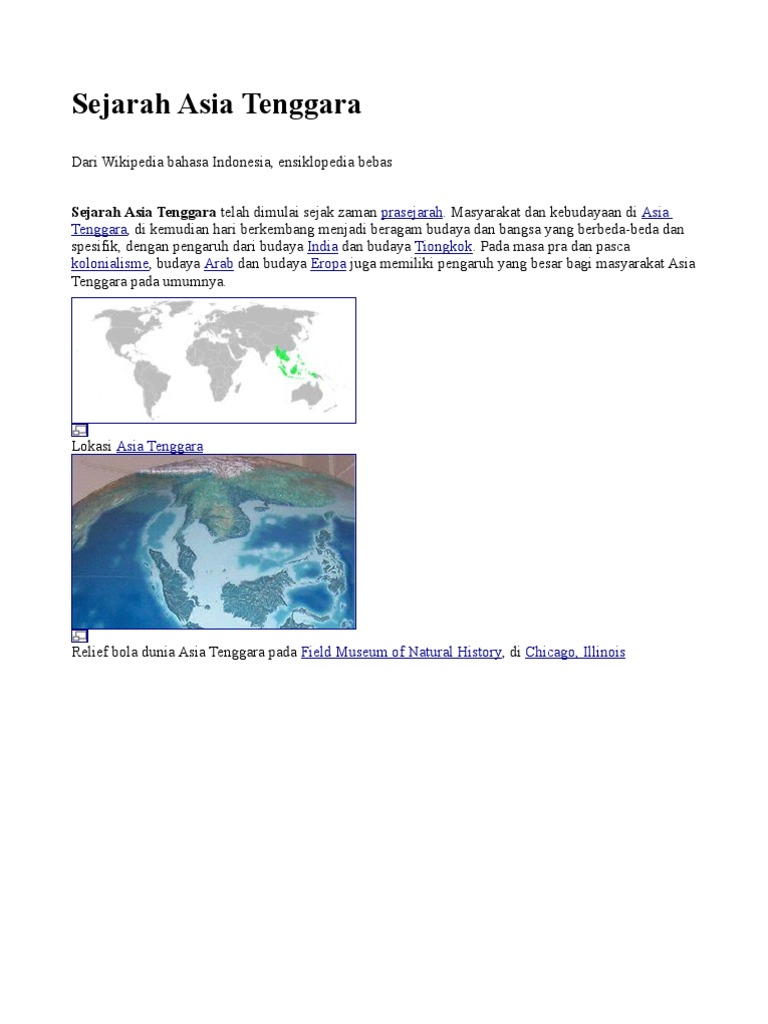 Tiga lokasi penting zaman prasejarah di asia tenggara. Pleistosen telah diklasifikasikan kepada tiga kriteria yang berbeza iaitu pada zaman glasial di daerah lintang tengah perubahan fauna laut dan perubahan fauna darat. Masyarakat dan kebudayaan di asia tenggara di kemudian hari berkembang menjadi beragam budaya dan bangsa yang berbeda beda dan spesifik dengan pengaruh dari budaya india dan budaya tiongkok. Sejarah asia tenggara telah dimulai sejak zaman prasejarah. Zaman ini juga dikenali sebagai zaman ais batu kerana pada ketika itu asia tenggara telah mengalami perubahan paras laut diiikuti sedikit perubahan suhu.