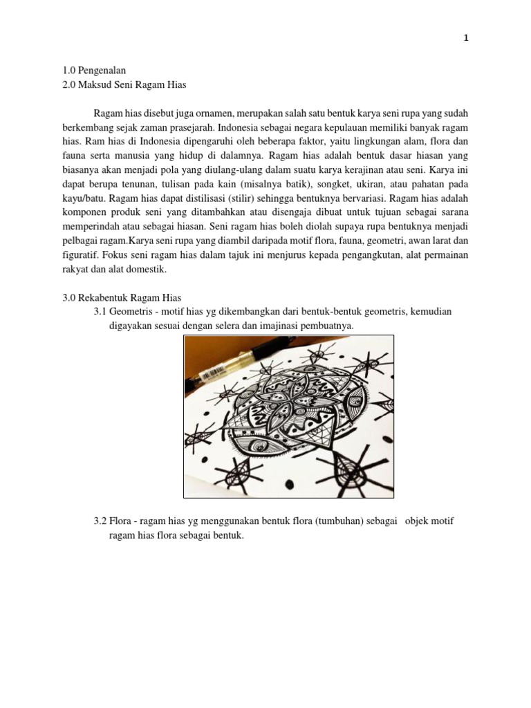 Menjelaskan seni ragam hias mengenal pasti tokoh seni ragam hias meneroka motif seni ragam hias yang terdapat pada. Ragam hias dapat diartikan sebagai hiasan berupa pola berulang yang biasanya dibuat pada suatu karya seni. Pola hias merupakan unsur dasar yang sering digunakan sebagai acuan dalam membuat rancangan hiasan. Merupakan karya seni rupa yang diambil pada motif flora fauna geometri awan larat dan figuratif.