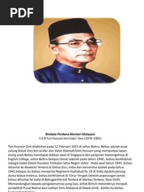 Tun hussein onn biodata. 29 mei 1990 south san francisco california united states. Biodata tun hussein bin dato onn perdana menteri malaysia ke 3 tun hussein bin dato onn perdana menteri malaysia ke 3 hussein onn menerima pendidikan awalnya di telok kurau school singapura kini telok kurau primary school sekolah rendah telok kurau dan di english college kini digelar maktab sultan abu bakar johor bahru. Beliau dilihat sebagai seorang yang amat ikhlas dalam perjuangan untuk mencapai perpaduan kaum dan mempunyai reputasi untuk bertindak keras kepada sesiapa yang mencuba membangkitkan kekacauan perkauman di dalam negara. Biodata tun hussein bin dato onn perdana menteri malaysia ke 3 tun hussein bin dato onn perdana menteri malaysia.
