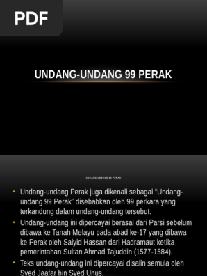 Undang undang 99 perak pdf. Undang undang republik indonesia nomor 40 tahun 1999 tentang pers dengan rahmat tuhan yang maha esa presiden republik indonesia menimbang. Bahasa inggerisnya ninety nine laws of perak adalah undang undang yang tertua dalam negeri perak. Undang undang sembilan puloh sembilan atau dalam. Beliau telah datang ke perak pada zaman pemerintahan sultan perak ke 11 iaitu sultan mahmud iskandar shah 1653 1720.