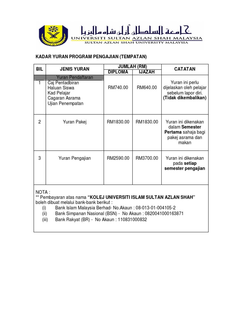 Universiti sultan azlan shah yuran. Sultan azlan shah university malay. No pendaftaran universiti. Universiti sultan azlan shah usas pada mulanya dikenali sebagai kolej islam darul ridzuan kisdar adalah hasil cetusan idea duli yang maha mulia paduka seri sultan perak darul ridzuan ke 34 al marhum sultan azlan muhibbuddin shah ibni al marhum sultan yussuf izzuddin shah pada tahun 1986. Situated in kuala kangsar perak it was previously known as sultan azlan shah islamic university college kuisas.